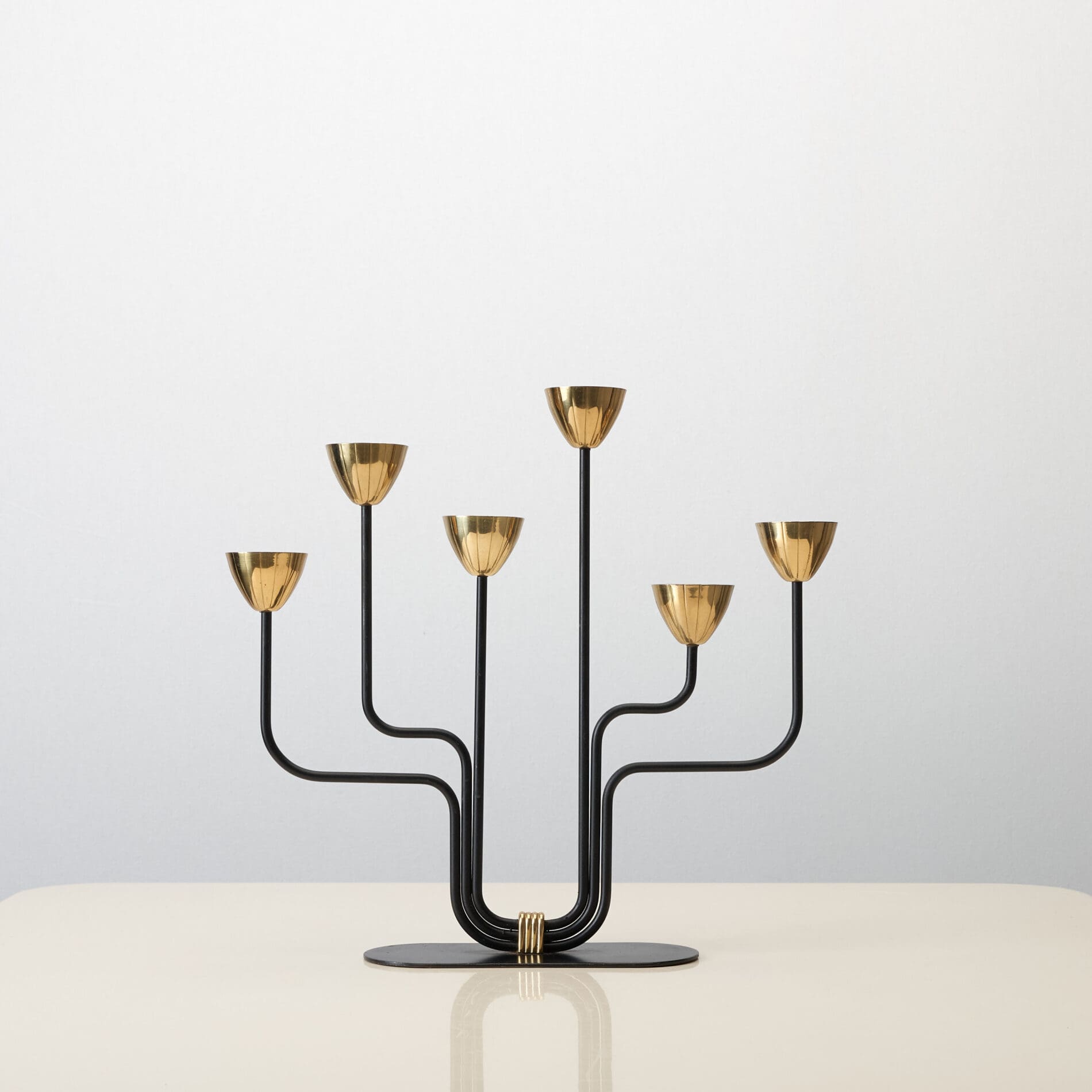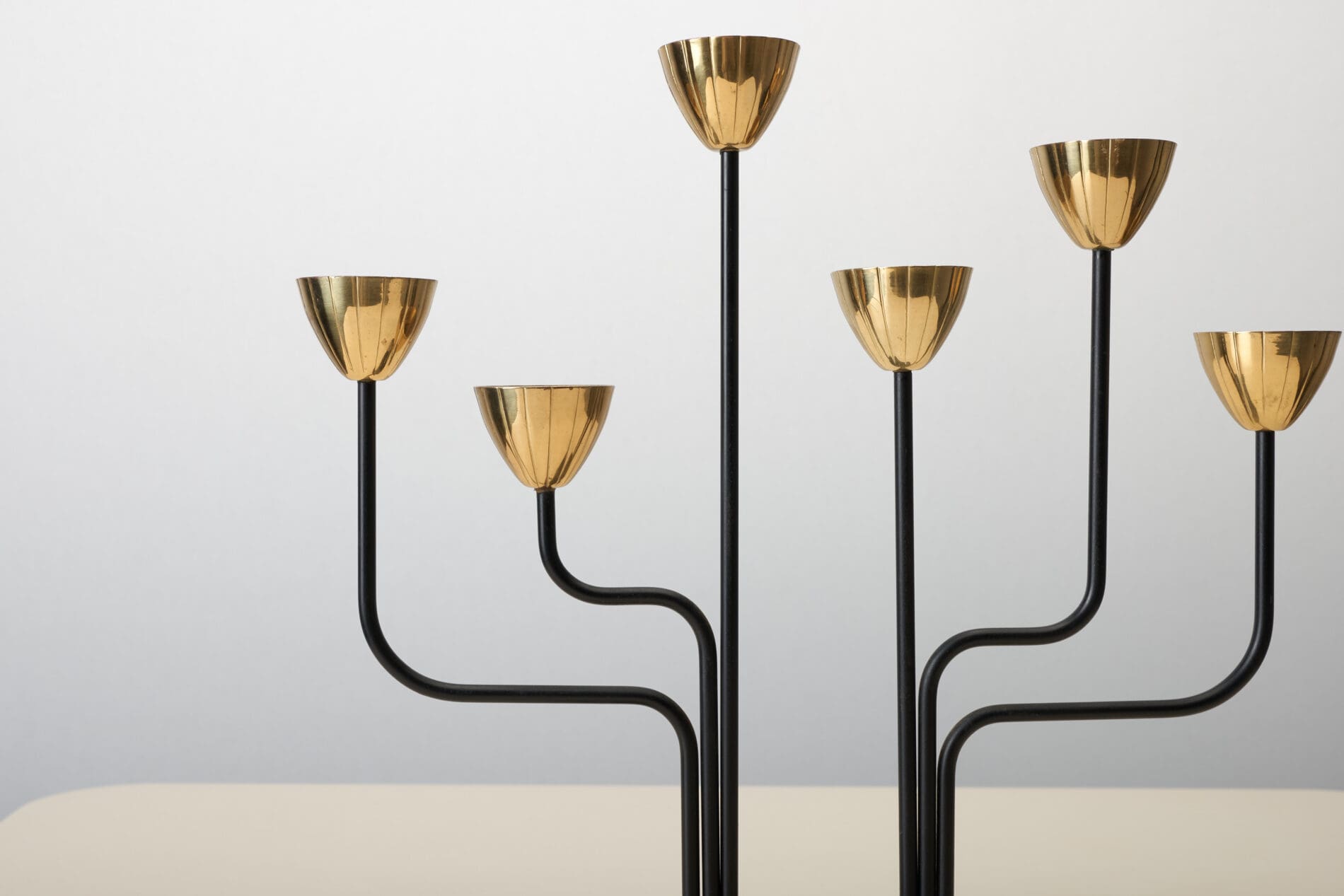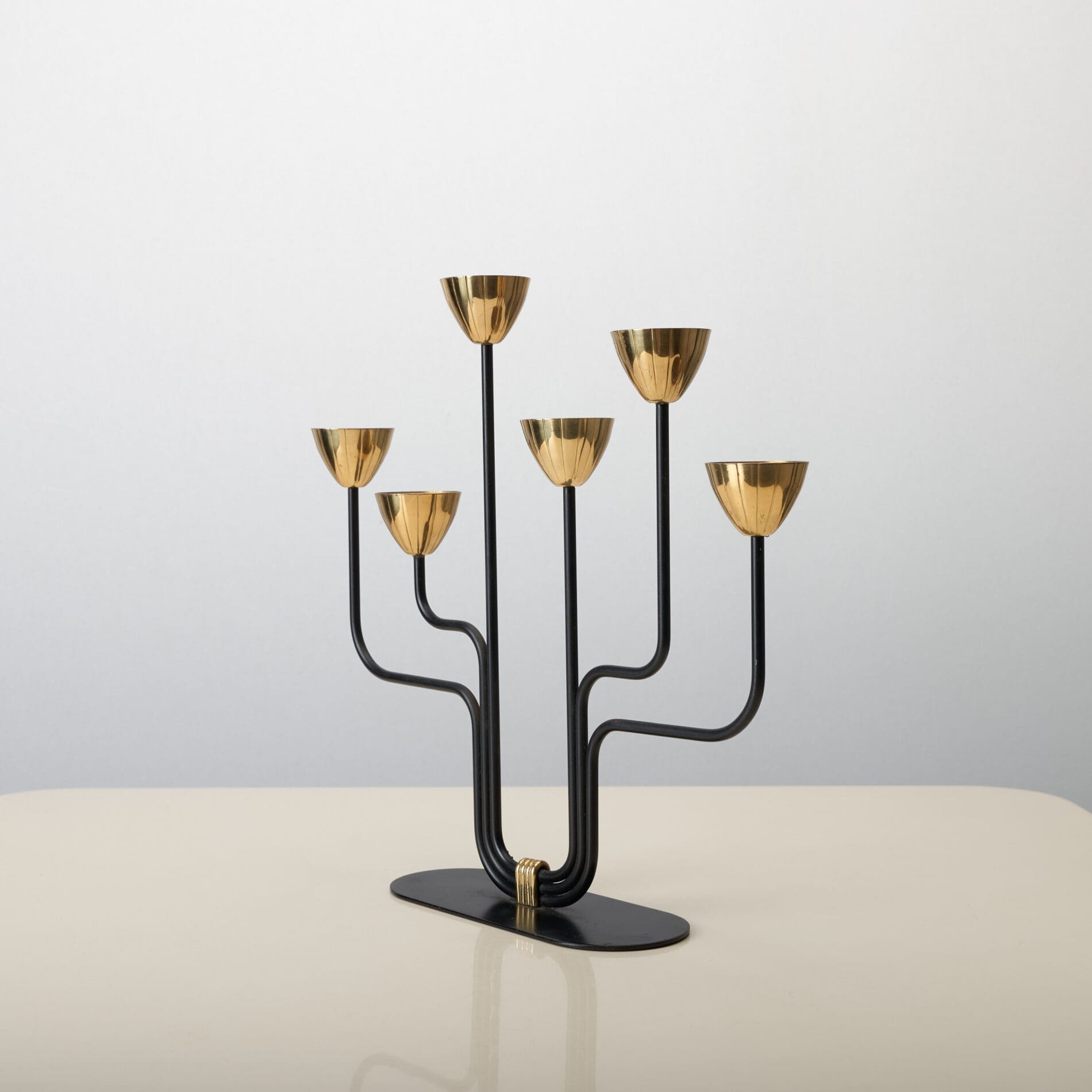 A brass and black painted steel candelabra by Swedish designer Gunnar Ander. The design features six stylised brass flowers on asymmetric arms.
