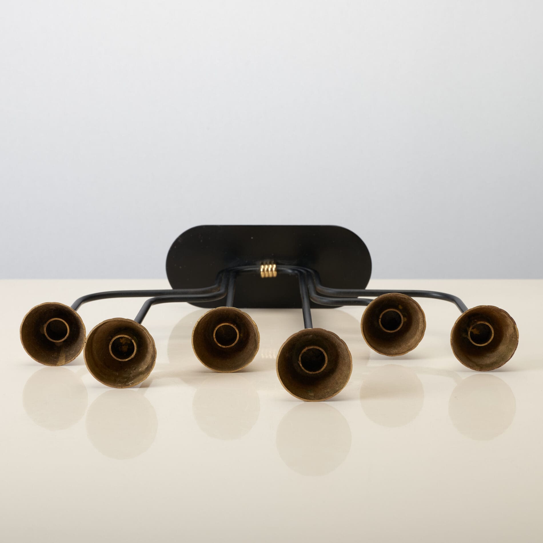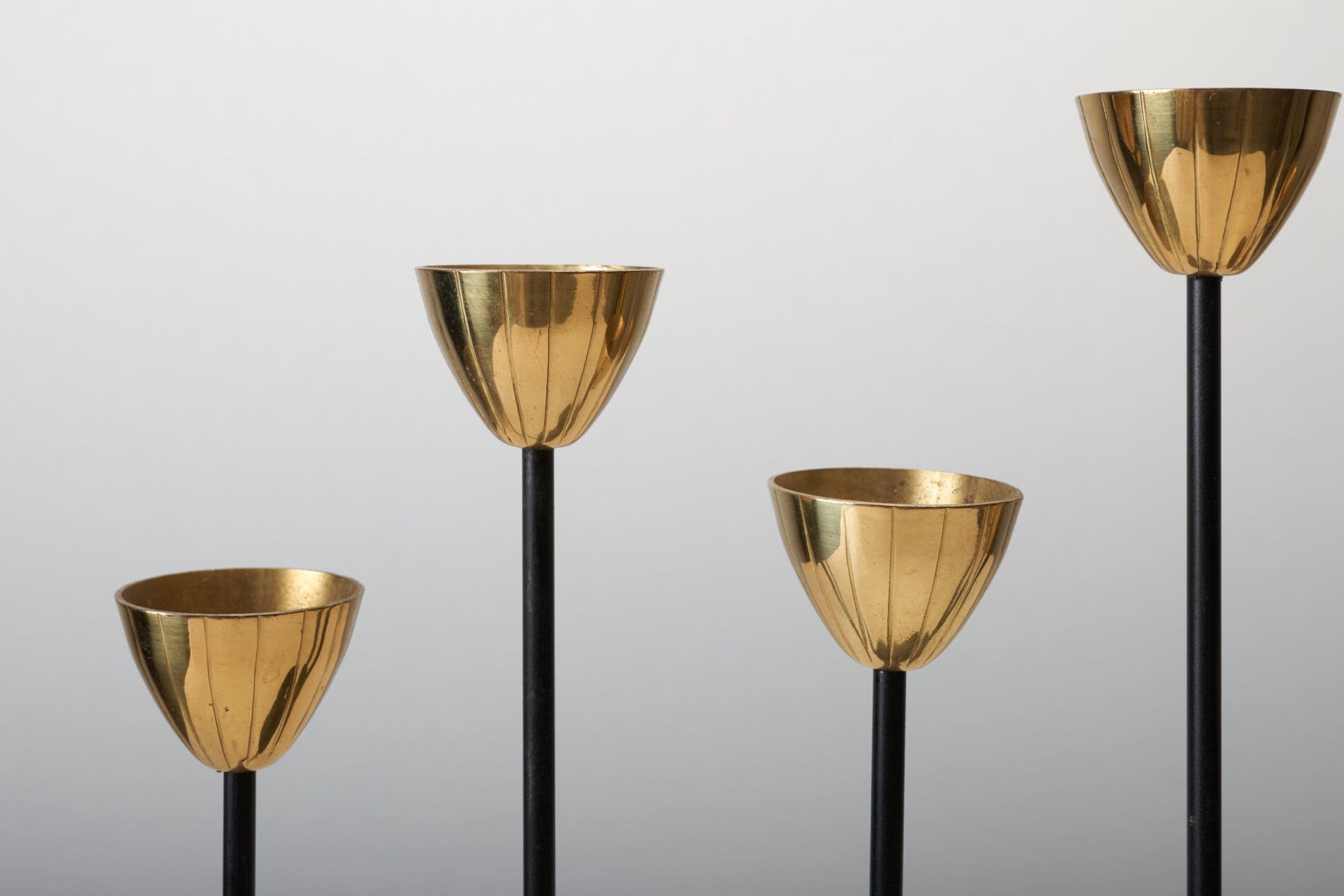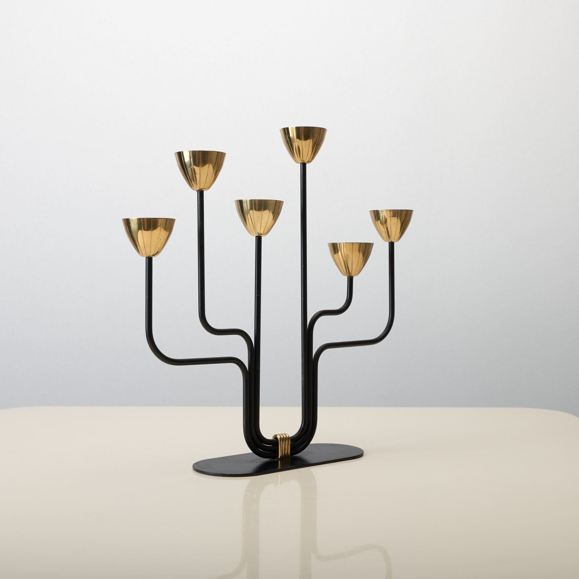 A brass and black painted steel candelabra by Swedish designer Gunnar Ander. The design features six stylised brass flowers on asymmetric arms.