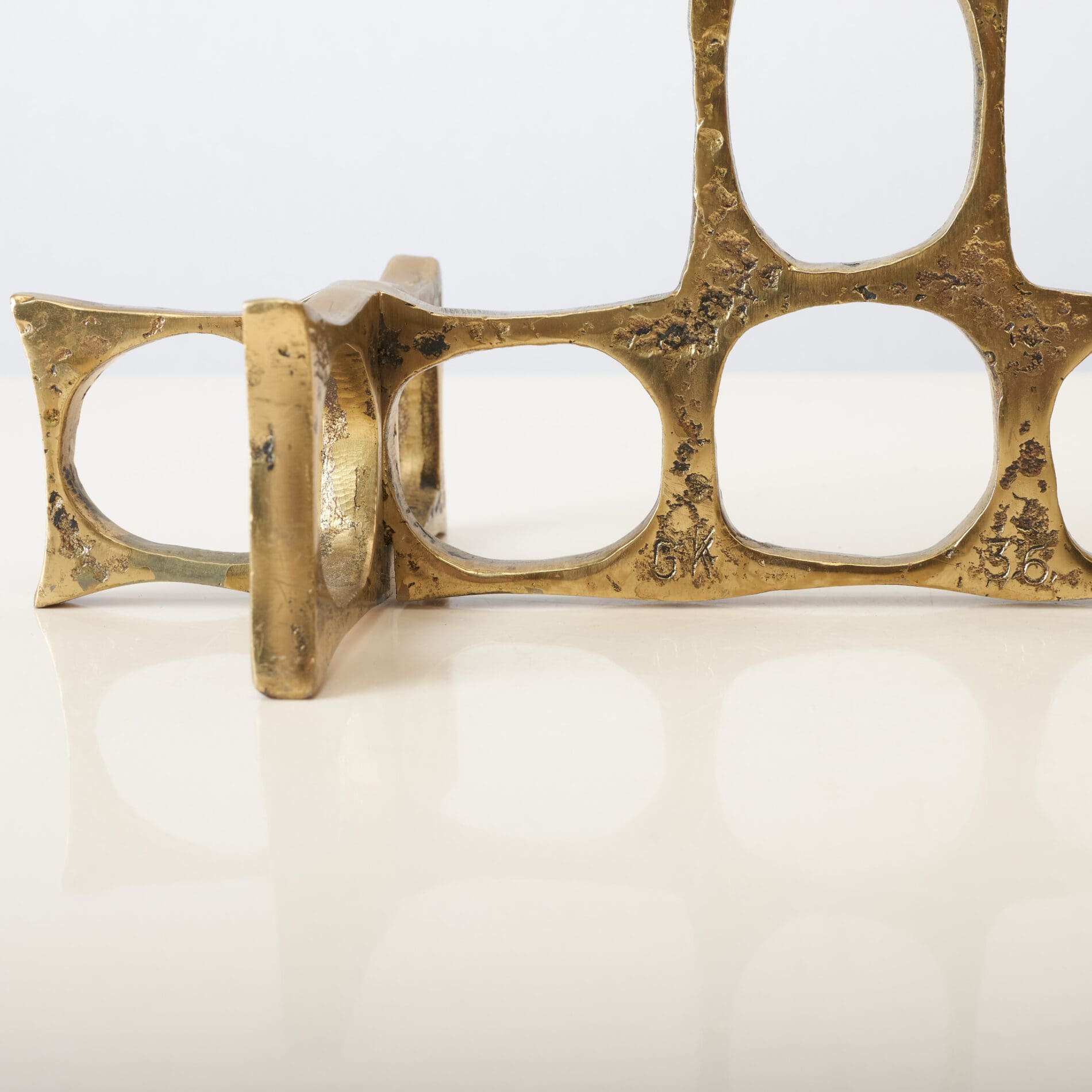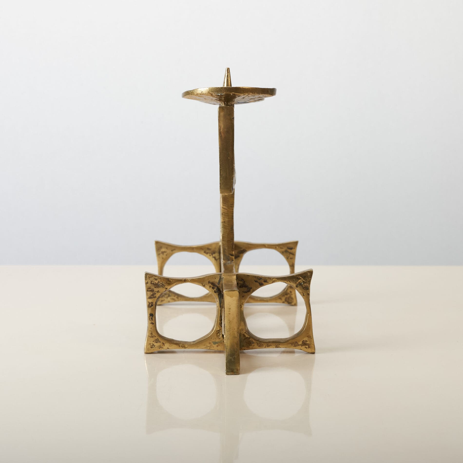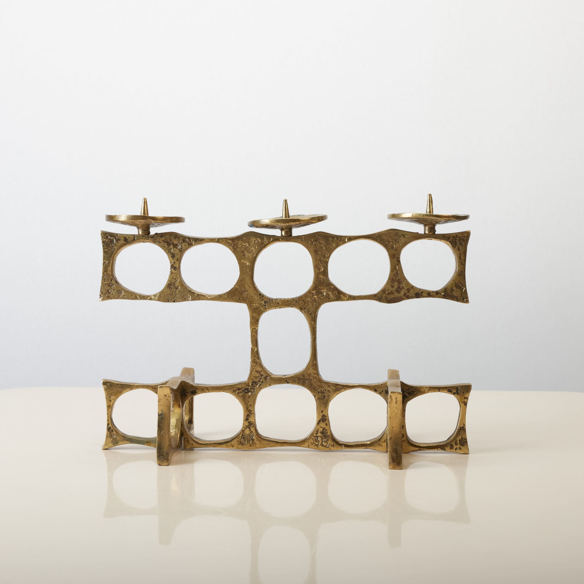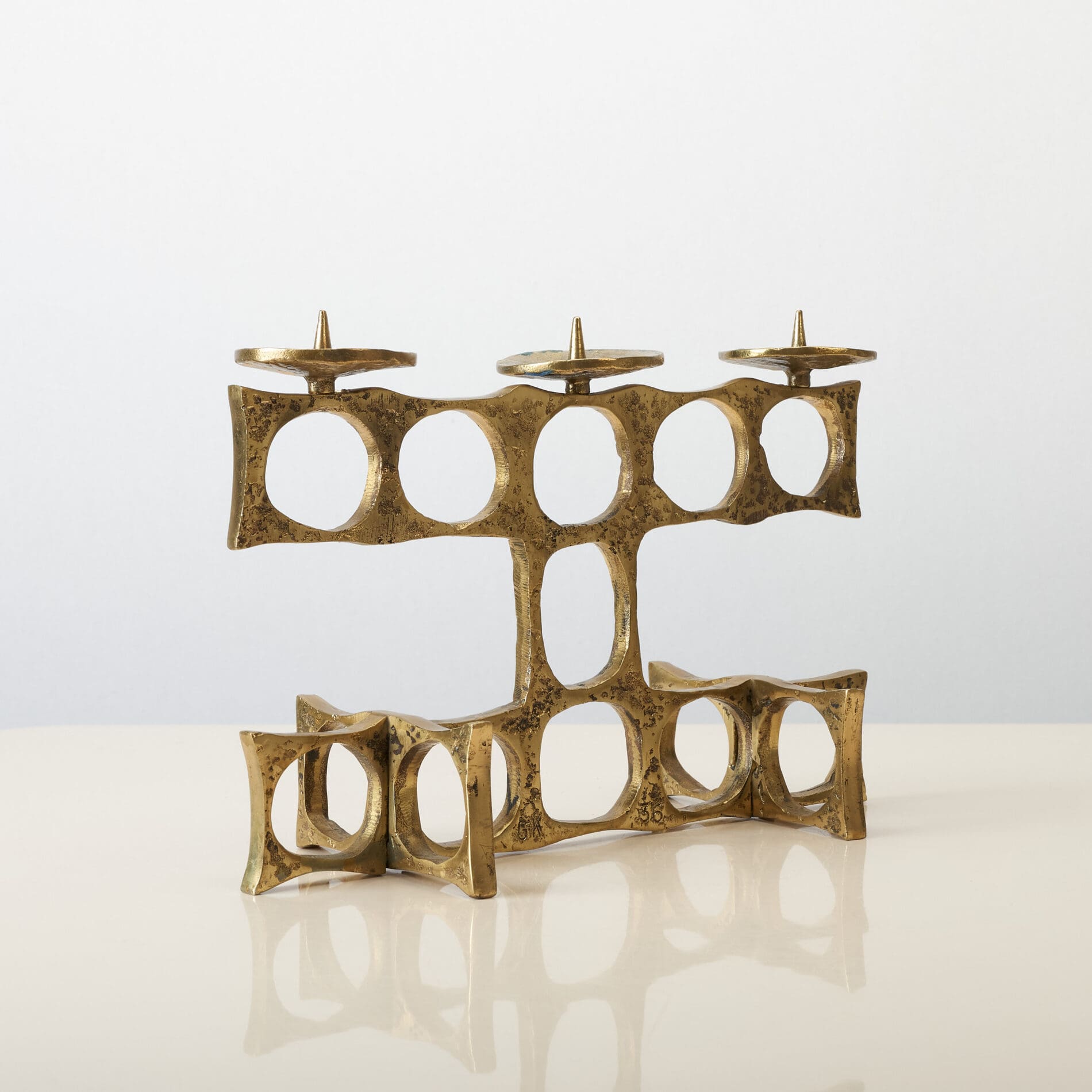A large brutalist three-light candelabra’s cast in bronze, designed by Austrian artist Heinz Goll. Suitable for various size candles up to 4 cm Diameter.