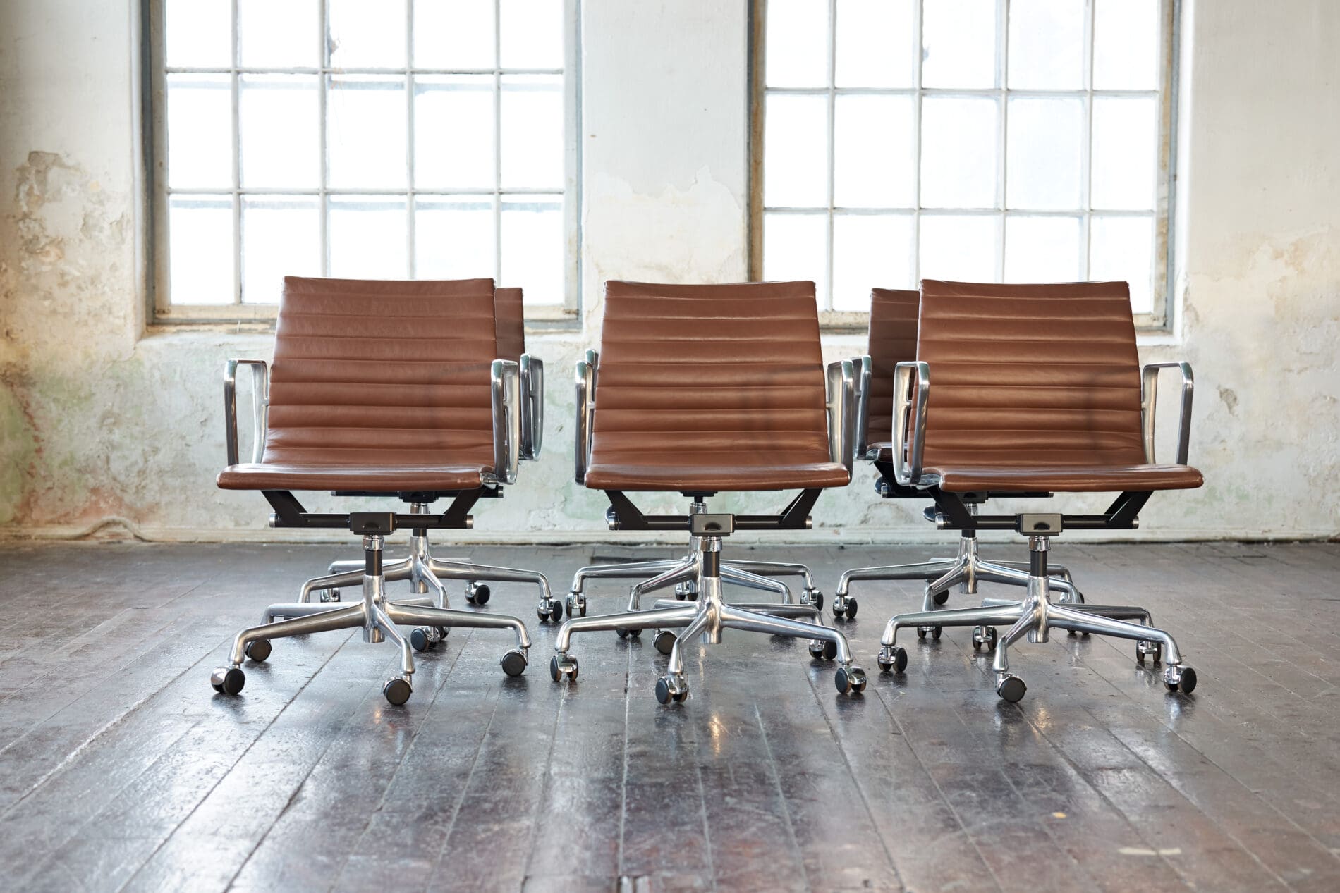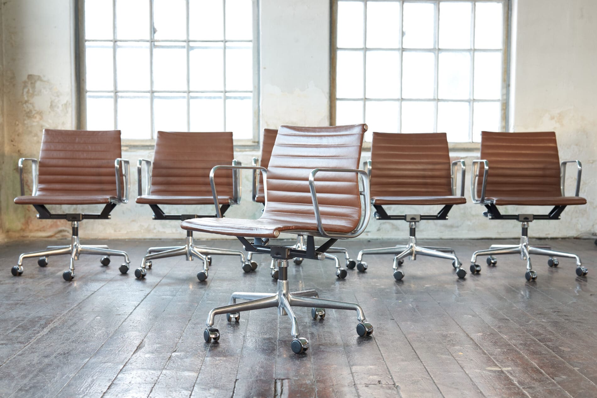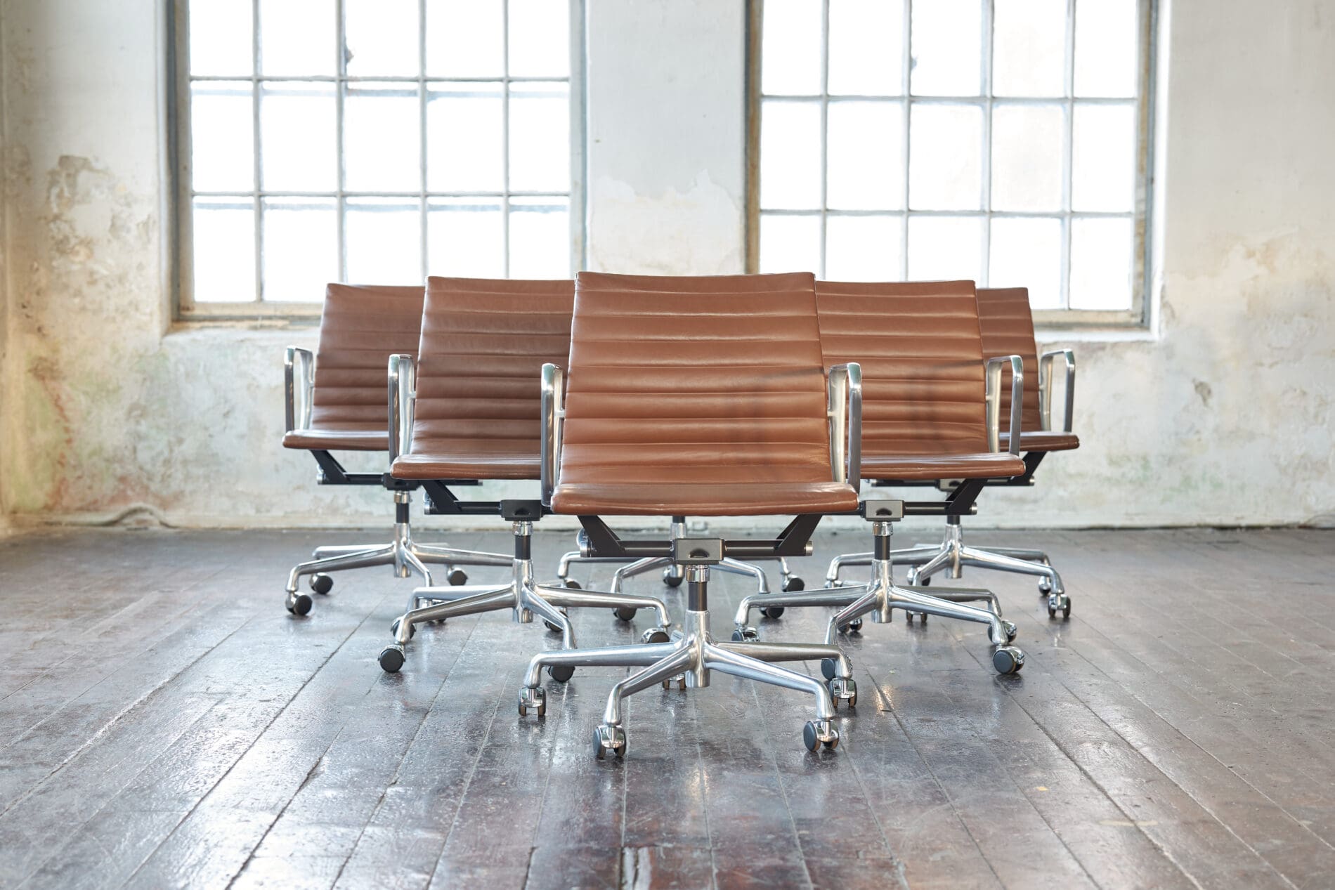 These examples date to 2009. The listed price includes one chair, and we have several chairs available for purchase in this color. Their design features a solid yet lightweight aluminum frame, and their upholstery is done in a brown Leather. They have a five-star base on casters that offers a full, 360-degree swivel, tilt and manual lift adjustment.
