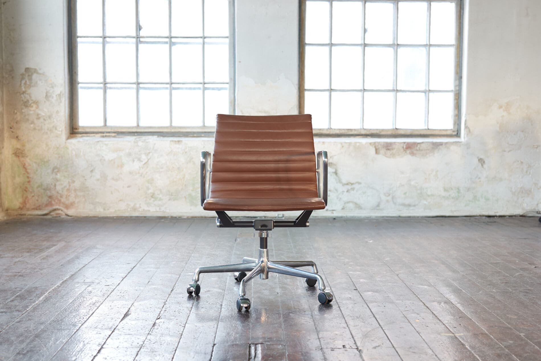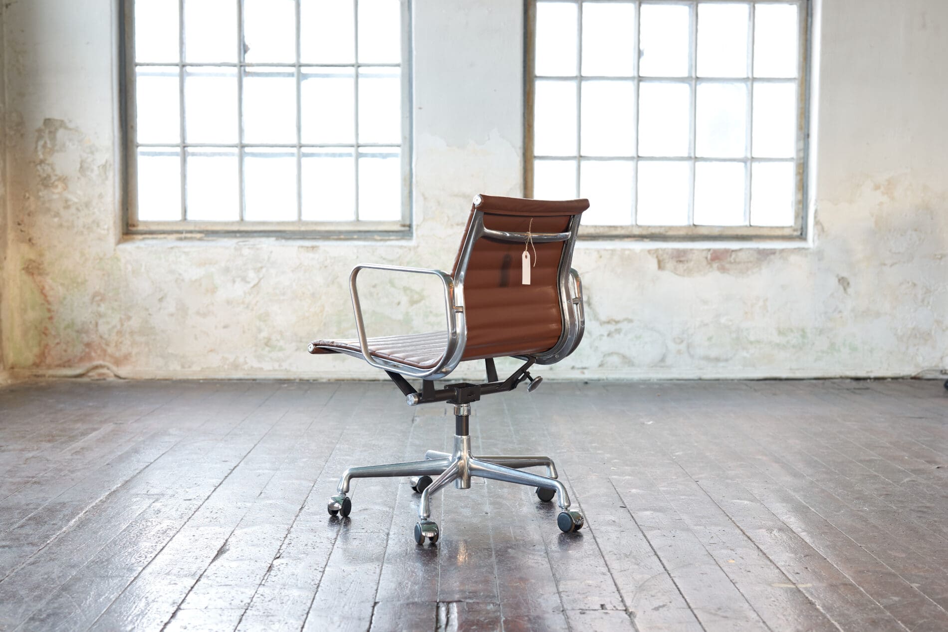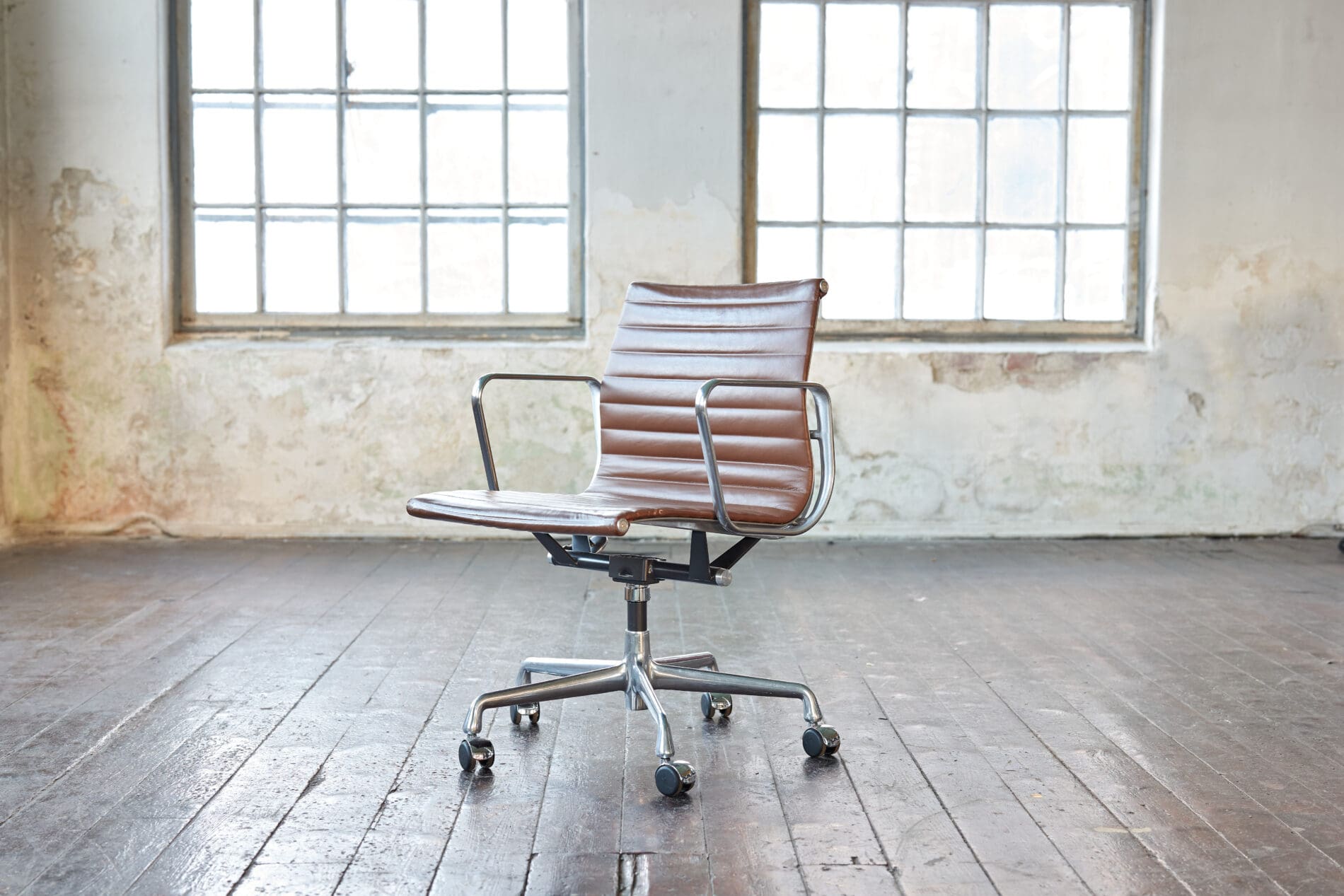 These examples date to 2009. The listed price includes one chair, and we have several chairs available for purchase in this color. Their design features a solid yet lightweight aluminum frame, and their upholstery is done in a brown Leather. They have a five-star base on casters that offers a full, 360-degree swivel, tilt and manual lift adjustment.
